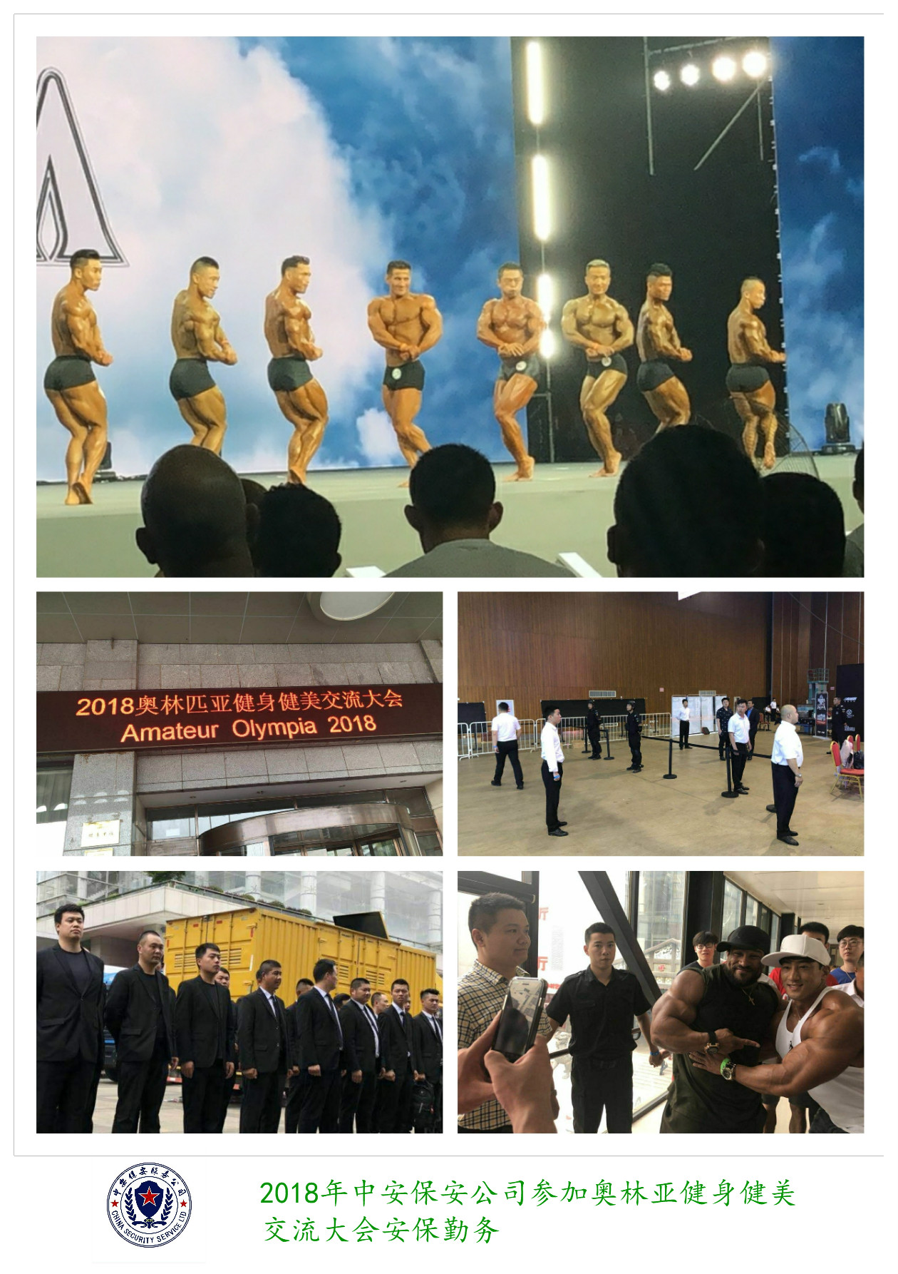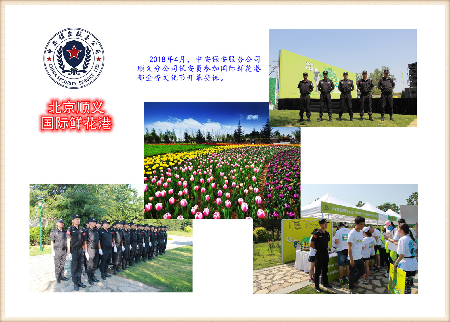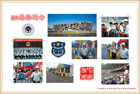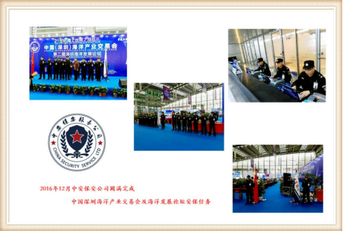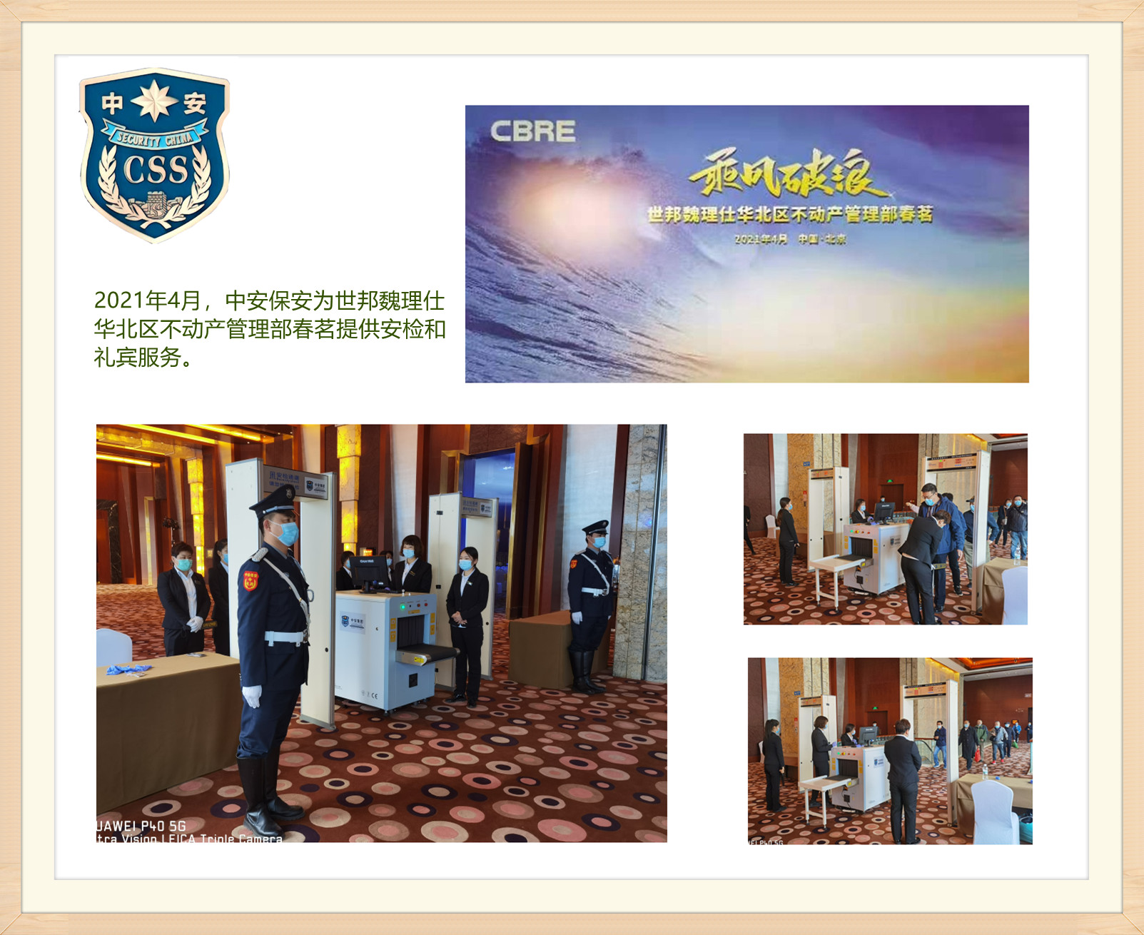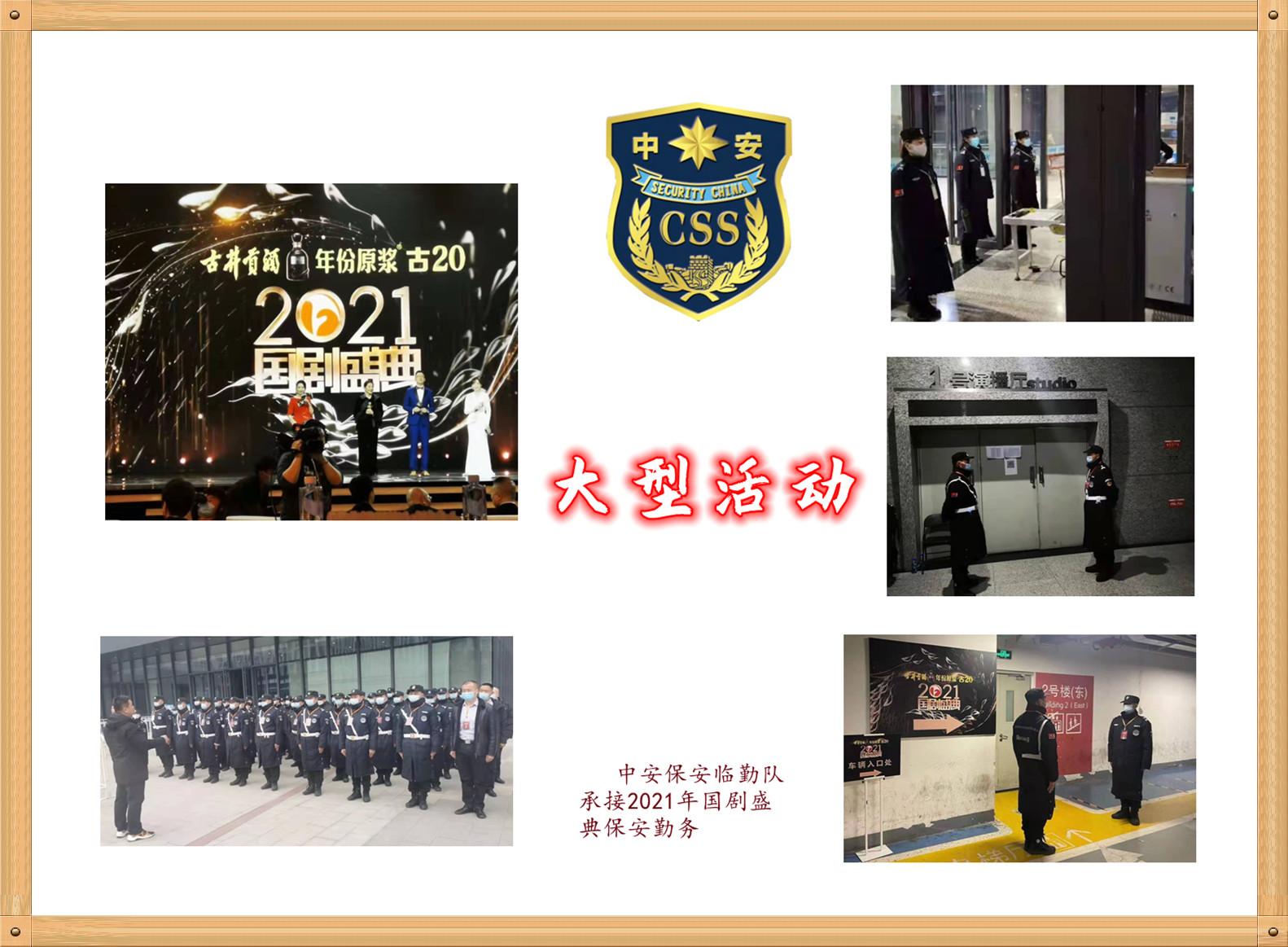 中安保安服务有限公司拥有一支高素质的安保队伍,成功为2008年第29届北京奥运会、2010年上海世博会、2014年APEC会议、2015年抗日战争暨世界反法西斯战争胜利70周年、2017年第一届、2019年第二届“一带一路”高峰论坛、2019、2020年全国两会等大型活动提供专业的安保服务。